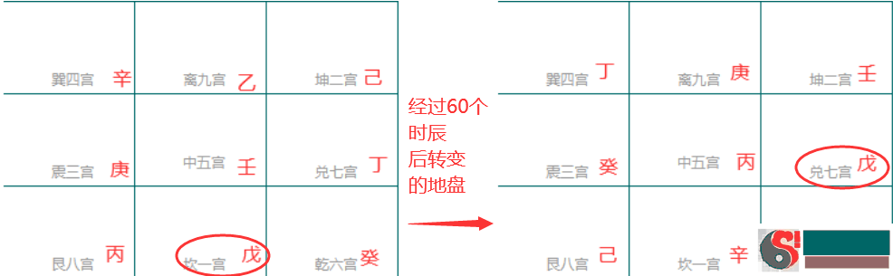 戊抵达七宫了就为阳遁七局。那再过60个时间(5天)以后应当变成几场。或是依照之前那一个规律,找此局丁的部位,能看下面的图